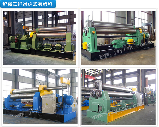 该机结构型式为三辊对称式,上辊在两下辊中央对称位置作垂直升降运动,通过丝杆丝母蜗杆传动而获得,两下辊作旋转运动,通过减速机的输出齿轮与下辊齿轮啮合,为卷制板材提供扭矩。